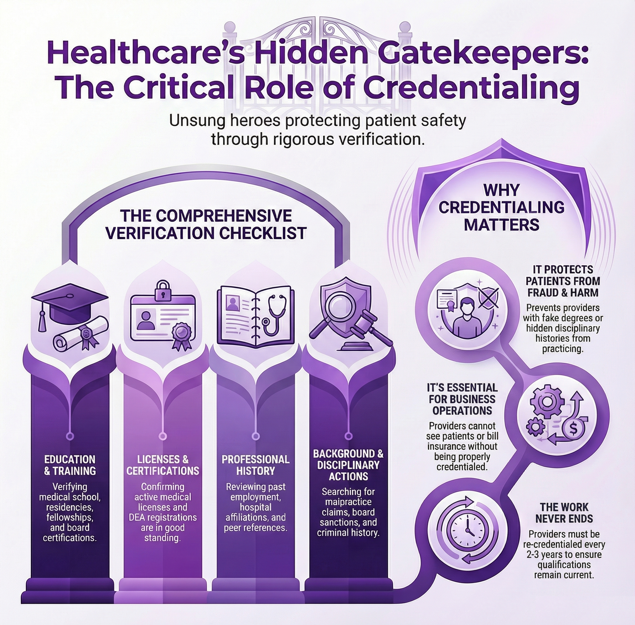 credentialing-specialists-gatekeepers-healthcare-safety-integrity-infographic An Infographic of Credentialing Specialists: Gatekeepers of Healthcare Safety and Integrity