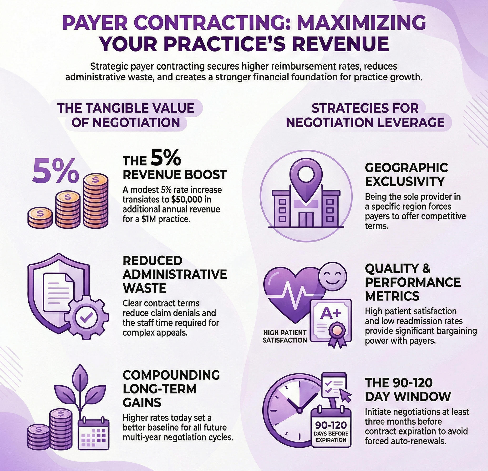 An infographic of how to maximize a payer’s revenue through payer contracting.